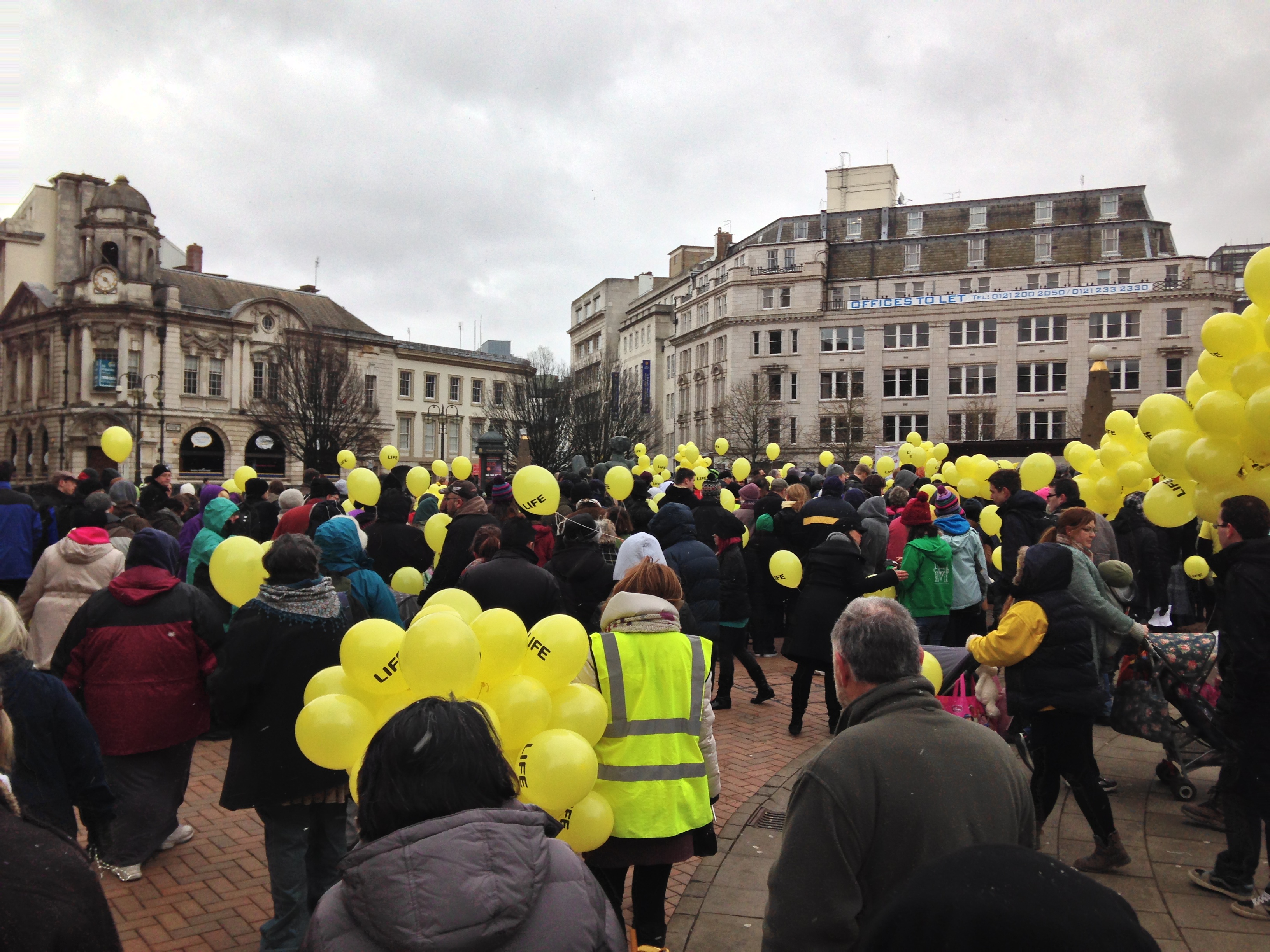 We turned many heads as we walked through the busy shopping district of Birmingham. We all held yellow balloons that said LIFE. Though ecumenical, it was clearly driven by the Catholic Church—there were many priests, religious, and seminarians, all praying the rosary and singing songs to our Lady as we walked through the streets. The organizers warned us that their might be some hostility, but the attitude of most of the onlookers was more of curiosity than condemnation. I don’t think they’ve ever seen something like that before.